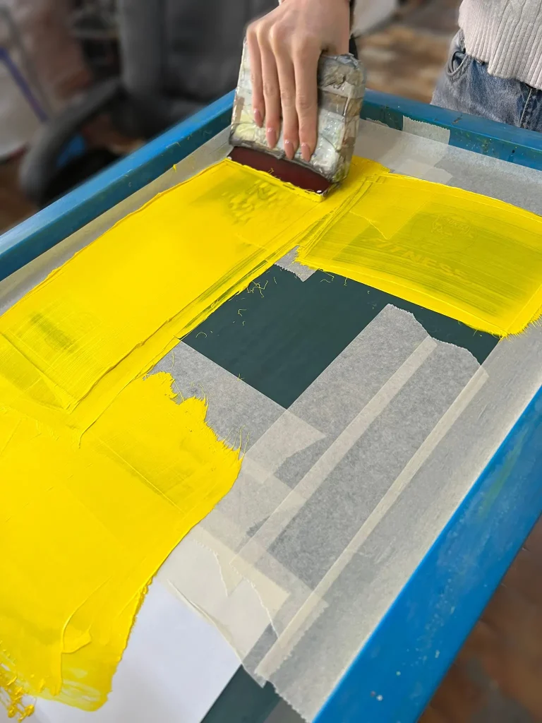 Il processo di serigrafia viene svolto tramite dei telai, questo viene posto sul supporto scelto, l’inchiostro viene poi posizionato sulla parte alta del telaio e con una spatola di gomma, detta anche racla, viene spalmato sull’intero telaio, l’inchiostro passa attraverso gli spazi aperti e si deposita sul supporto (carta, tela, stoffa ad esempio) e va fissato attraverso un processo termico ad alta temperatura.